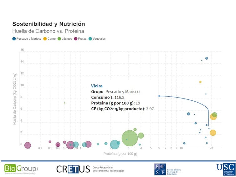 Si se compara el contenido proteico y la huella de carbono para los diferentes grupos de alimentos: carnes, pescado y mariscos, vegetales, lácteos y frutas (figura 4), la vieira se encuentra situada entre aquellos que aportan una mayor cantidad de proteína (similar a la carne o al queso) pero con una menor huella de carbono.