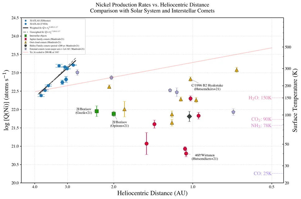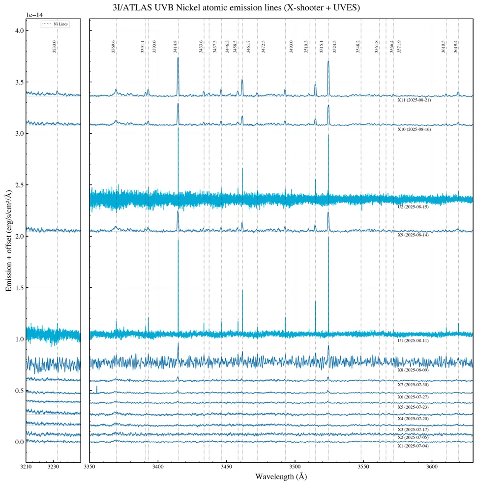El descubrimiento del vapor de níquel procede de un equipo internacional de astrónomos que trabaja con los espectrógrafos X-shooter y UVES del Very Large Telescope (VLT), en Chile. Utilizando análisis espectral, identificaron líneas de emisión correspondientes a átomos de níquel cuando el cometa se encontraba a más de 3.8 unidades astronómicas del Sol, una distancia donde las temperaturas deberían mantener los metales totalmente congelados.