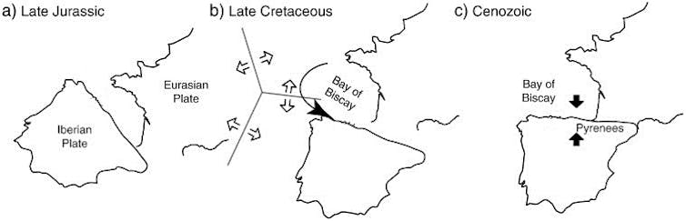 En el Cretácico (hace unos 120 millones de años) la península Ibérica era parte, junto con partes del sur de Europa, de la llamada microplaca Ibérica. Esta se movía de manera independiente a la Europea, y entre ambas se encontraba el océano de Valais.