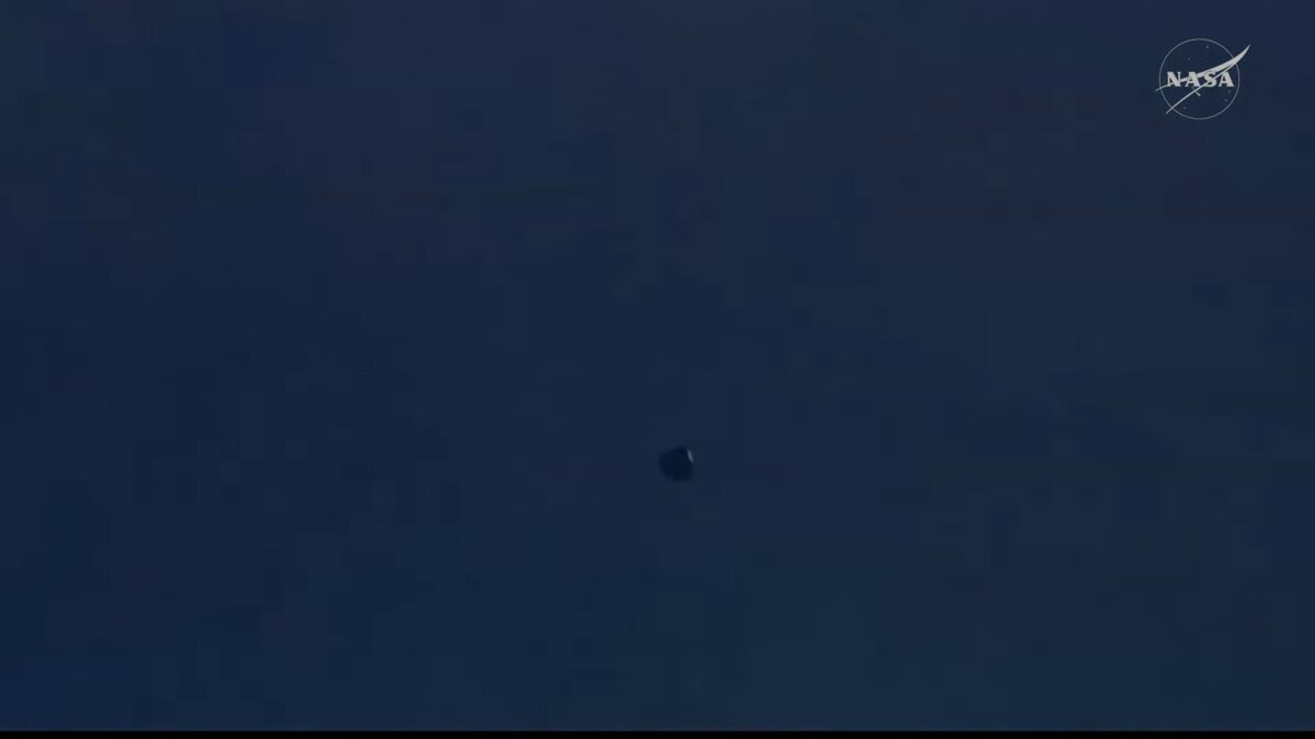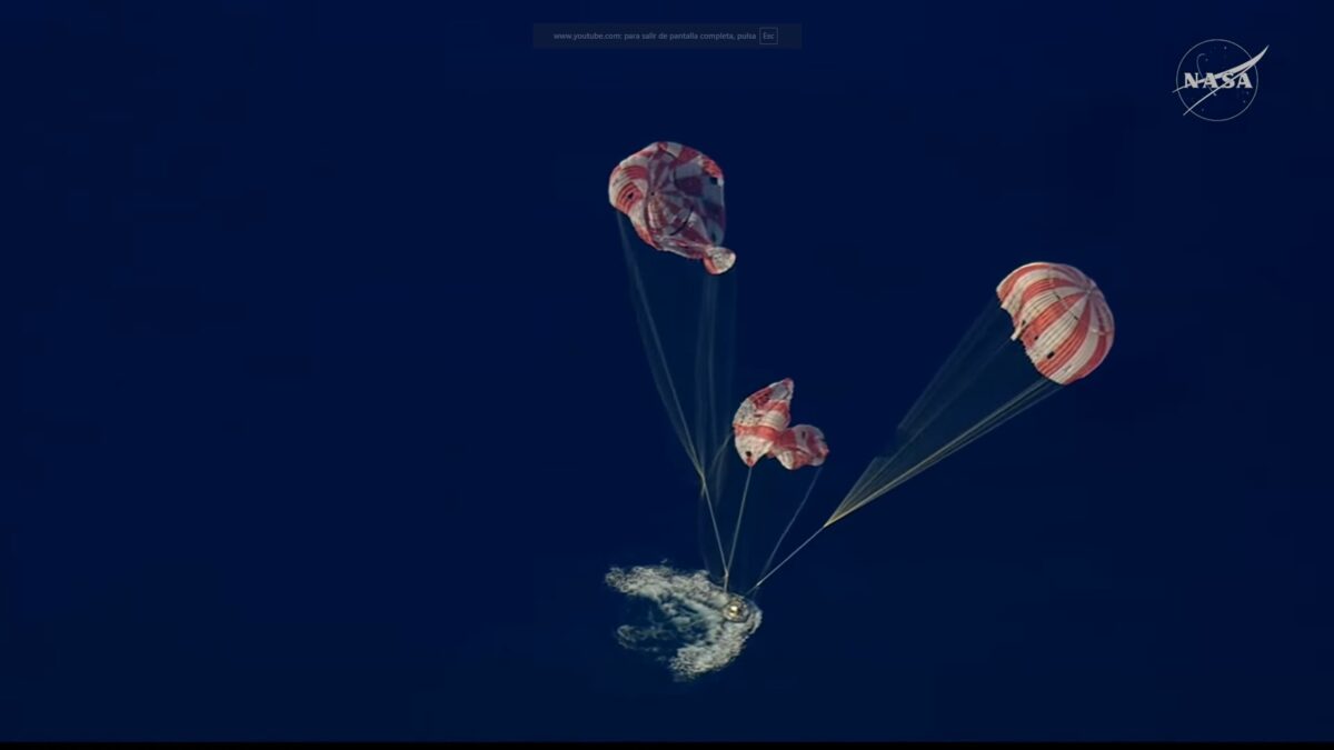 Y a las 2:05 los paracaídas principales se despliegan correctamente y la baliza de rescate de la nave se activa.