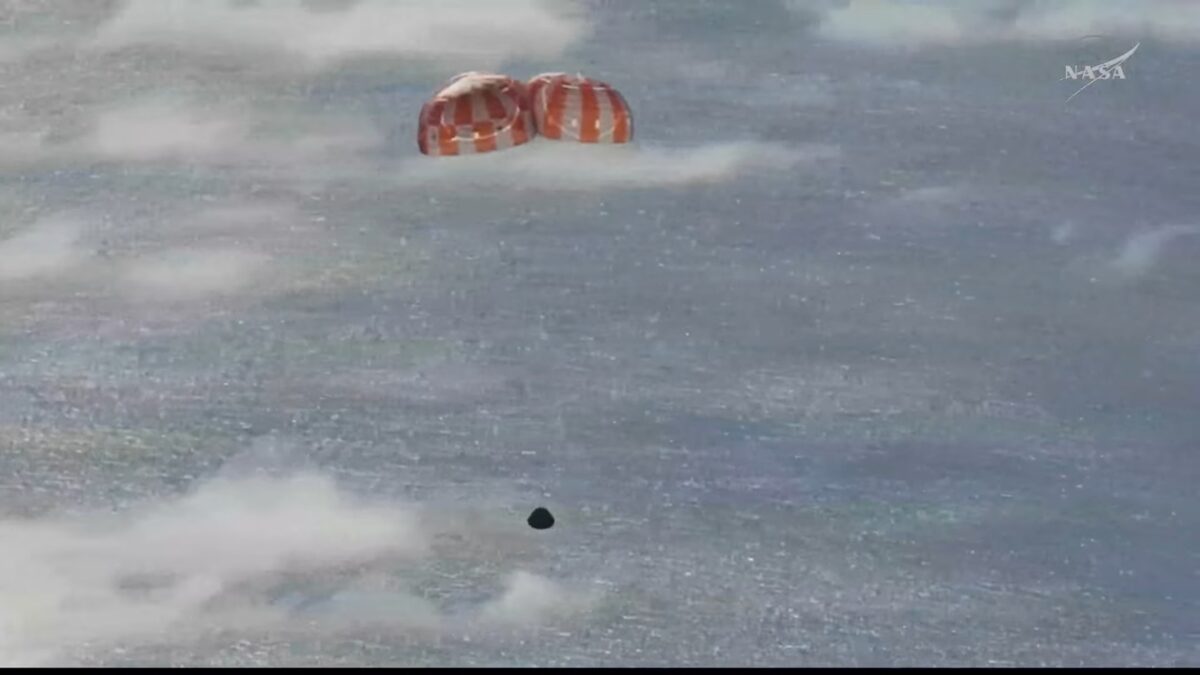 La Orion desciende colgada ya de sus tres paracaídas principales. NASA