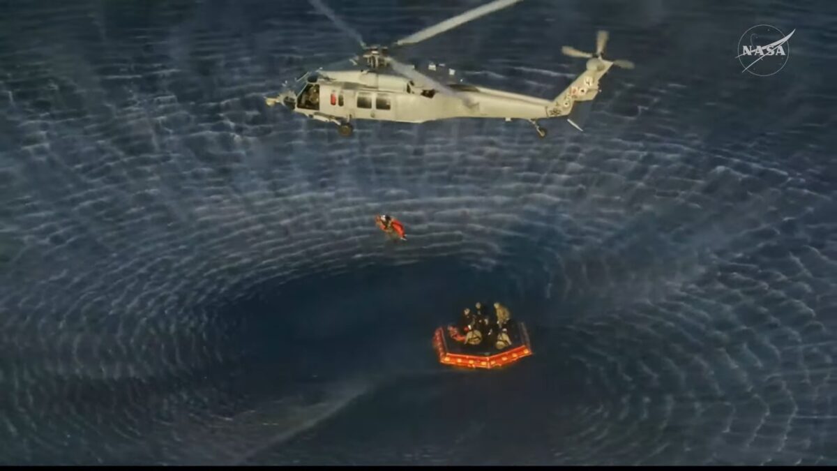 Ya está confirmado que la nave es segura, y lo siguiente es instalar una balsa inflable delante de la escotilla. Los astronautas pasarán de la nave a ella y luego serán izados de uno en uno a los helicópteros.