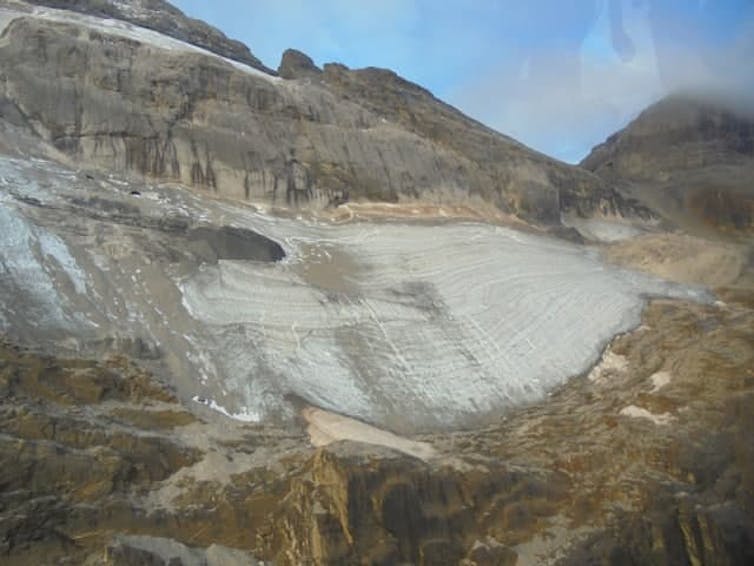 Vista del glaciar de Monte Perdido desde el norte, tomada desde helicóptero en octubre del 2017. Se aprecian muchos derrubios sobre el glaciar. María Leunda, Author provided