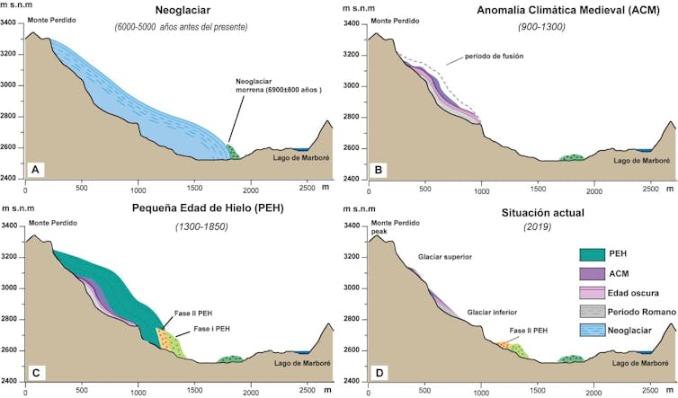 Perfiles donde se ha reconstruido la masa de hielo del glaciar de Monte Perdido a lo largo del tiempo, basados en las dataciones de los depósitos morrénicos y del hielo del glaciar. Modificada de Moreno et al., 2021, Author provided