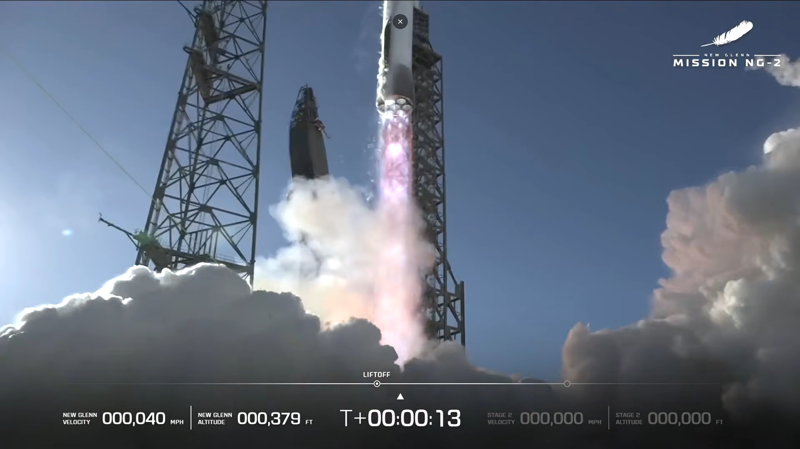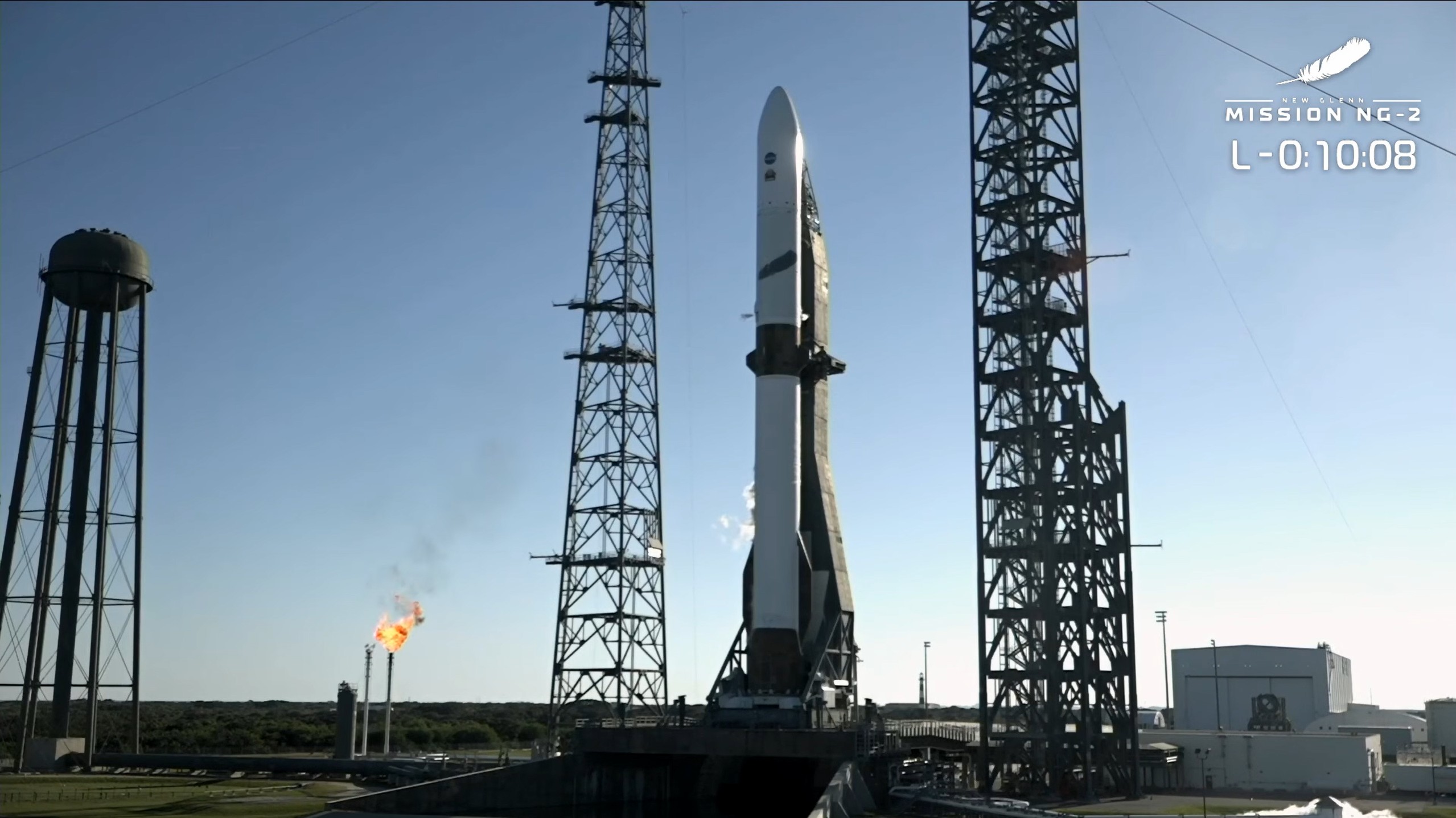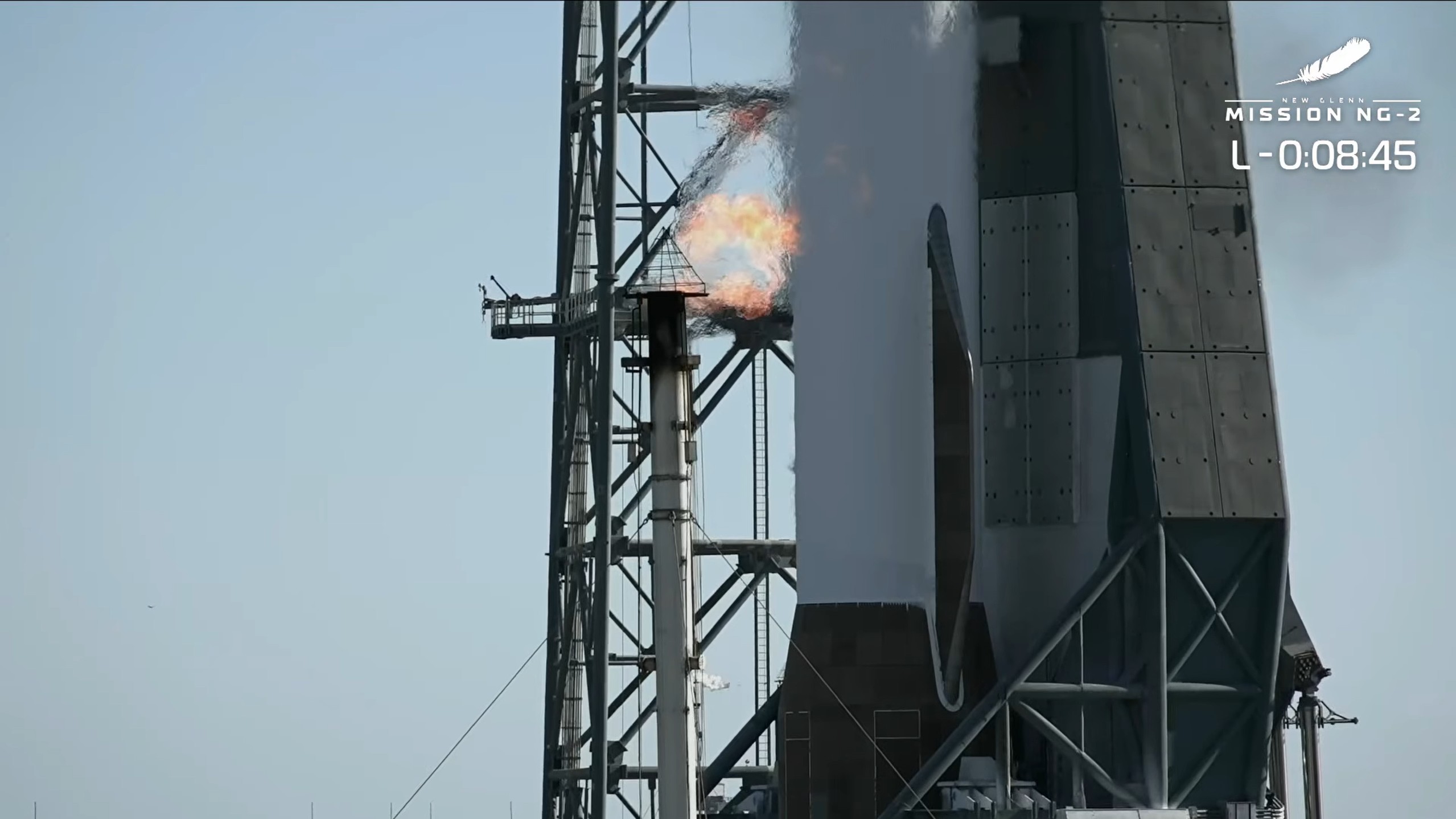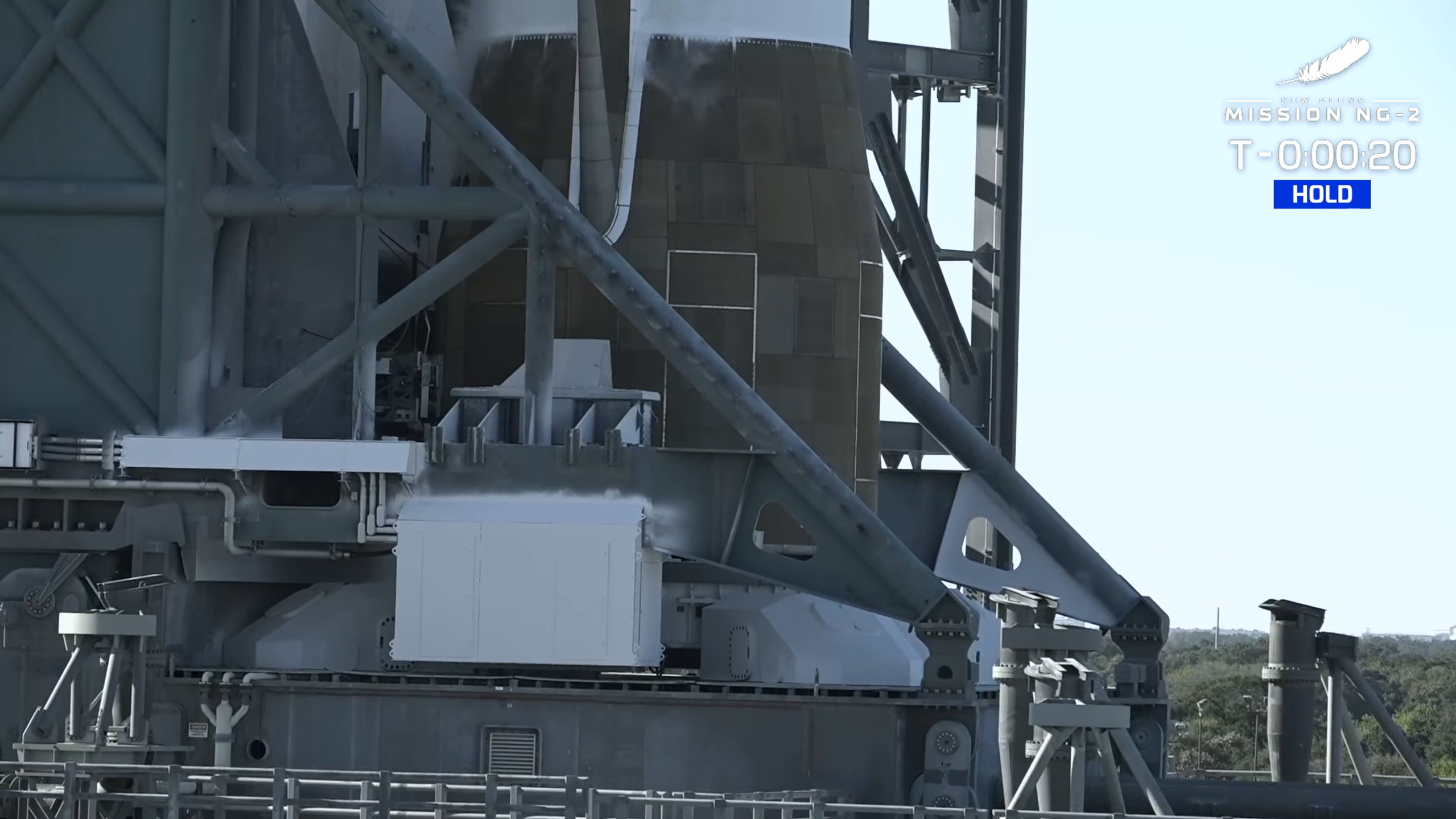 Quedan menos de cuatro minutos, el cohete vuelve a estar funcionando autónomamente. El brazo erector del cohete se separa ligeramente para permitir al New Glenn escapar del complejo de lanzamiento y la presurización está a punto.