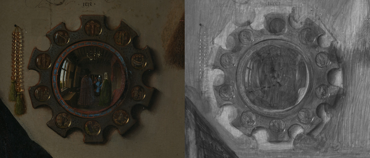 Comencemos por decir que el espejo que van Eyck pintó difiere un tanto de la idea originaria que tenía. La reflectografía infrarroja nos permite saber que en una primera instancia el artista dibujó un espejo ligeramente más grande, por lo menos en cuanto al marco se refiere. Gracias a esta técnica analítica podemos contemplar la silueta del aspecto que pudo haber tenido. Cabe destacar que, además de un tamaño mayor, el marco iba a tener tan solo ocho segmentos en lugar de los diez que ahora tiene y que sirvieron al pintor para dibujar escenas del Vía Crucis.