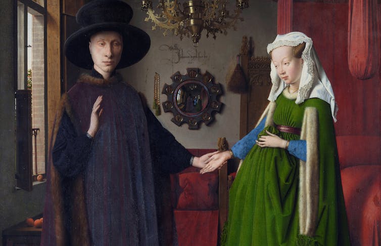El prestigioso historiador del arte Erwin Panofsky sostenía que representaba el enlace entre Giovanni Arnolfini y su esposa Giovanna Cenami. El sacerdote y el testigo indispensables para celebrar la ceremonia aparecerían… en el espejo. Pero, hoy por hoy, ni la propia National Gallery, museo donde se encuentra el cuadro, mantiene esa teoría.