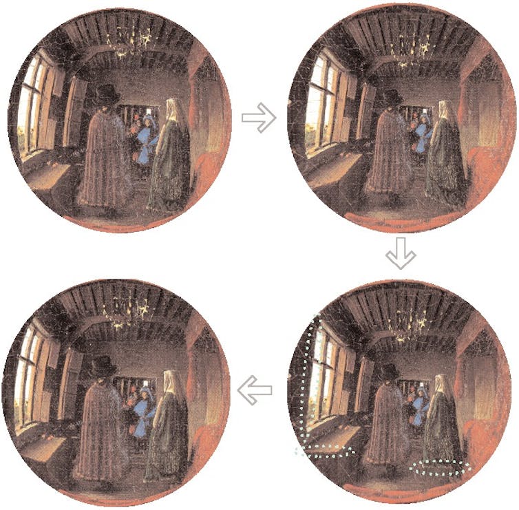 Ahora bien, la ciencia es implacable y, si se encuentra un fallo, hay que intentar arreglarlo. Los investigadores tomaron el espejo una vez transformado y retocaron aquellas zonas que todavía mostraban distorsión: el borde izquierdo de la ventana y de la mesa y la parte inferior del vestido de la mujer. Una vez hecho estos cambios, hicieron el proceso inverso: revertieron la transformación y obtuvieron el espejo más realista posible. O, por lo menos, el que mejor obedece las leyes de la óptica. Como podéis ver en la imagen inferior, no difiere en exceso de lo que pintó van Eyck. Quizás lo más destacable, además de la mencionada ventana, es que la mesa original no toma la forma curvada que le correspondería por estar en el borde del espejo.