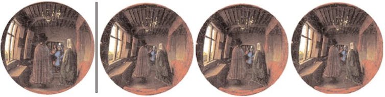 Al aplicar esta metodología en El retrato Arnolfini las diferencias entre los tres modelos fueron mínimas, pero podemos ver que en ningún caso se puede obtener una imagen “correcta” de la realidad (imagen inferior). El lugar más fácil para observar ese hecho es la ventana. Mientras casi todas las distorsiones del espejo se corrigen y se obtienen objetos más o menos rectos, la parte izquierda del marco de la ventana sigue teniendo un aspecto curvado. Por lo tanto, ahí van Eyck se alejó un tanto de la imagen que en realidad hubiese proyectado el espejo. Teniendo en cuenta que lo pintó hace casi seiscientos años, se lo podemos perdonar.