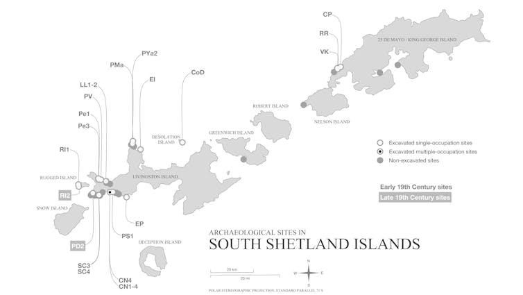 Los restos de las primeras ocupaciones humanas en Antártida se ubican en las islas Shetland del Sur. Lo demuestran más de 30 refugios y campamentos abandonados en las costas de las distintas islas, descubiertos durante las investigaciones arqueológicas.