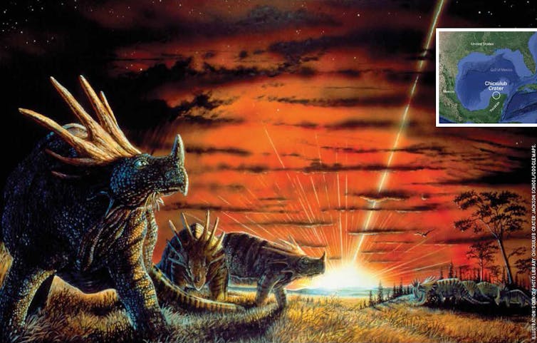 El culpable fue un asteroide de unos 12 kilómetros de diámetro que cayó frente a la península del Yucatán, escupiendo fuego y cenizas. Su impacto esculpió en décimas de segundo el cráter Chicxulub, descubierto por casualidad a finales de los años 70 mientras se buscaban recursos petrolíferos. Sería descrito e identificado como tal en 1991 por el geólogo Alan R. Hildebrand.