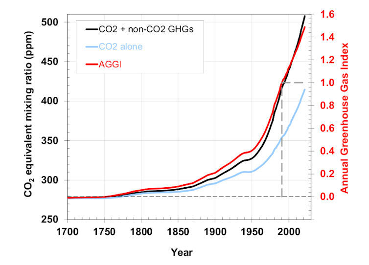 En 800 000 años de historia de la Tierra, la concentración de dióxido de carbono en la atmósfera fluctuó entre 172 y 299 partes por millón. Desde 1950, se ha producido un crecimiento drástico de las emisiones de CO₂, que han aumentado su concentración en la atmósfera desde las 300 hasta las 415 partes por millón en 2021. Un incremento del 38,7 % en solo tres cuartos de siglo.