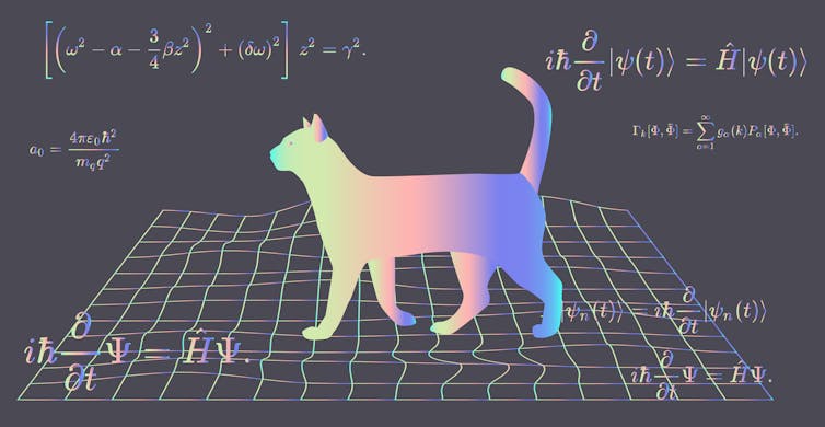 Un científico concienzudo y empeñado en garantizar la calidad predictiva de lo que hace querrá elaborar un modelo que permita anticipar qué ha sucedido con el gato antes de verlo con sus propios ojos. Recurrirá entonces a una formulación del problema en clave de mecánica cuántica. Así, el gato vendrá descrito por una función de onda complicada que será resultado de la superposición de los dos estados posibles combinados al cincuenta por ciento: