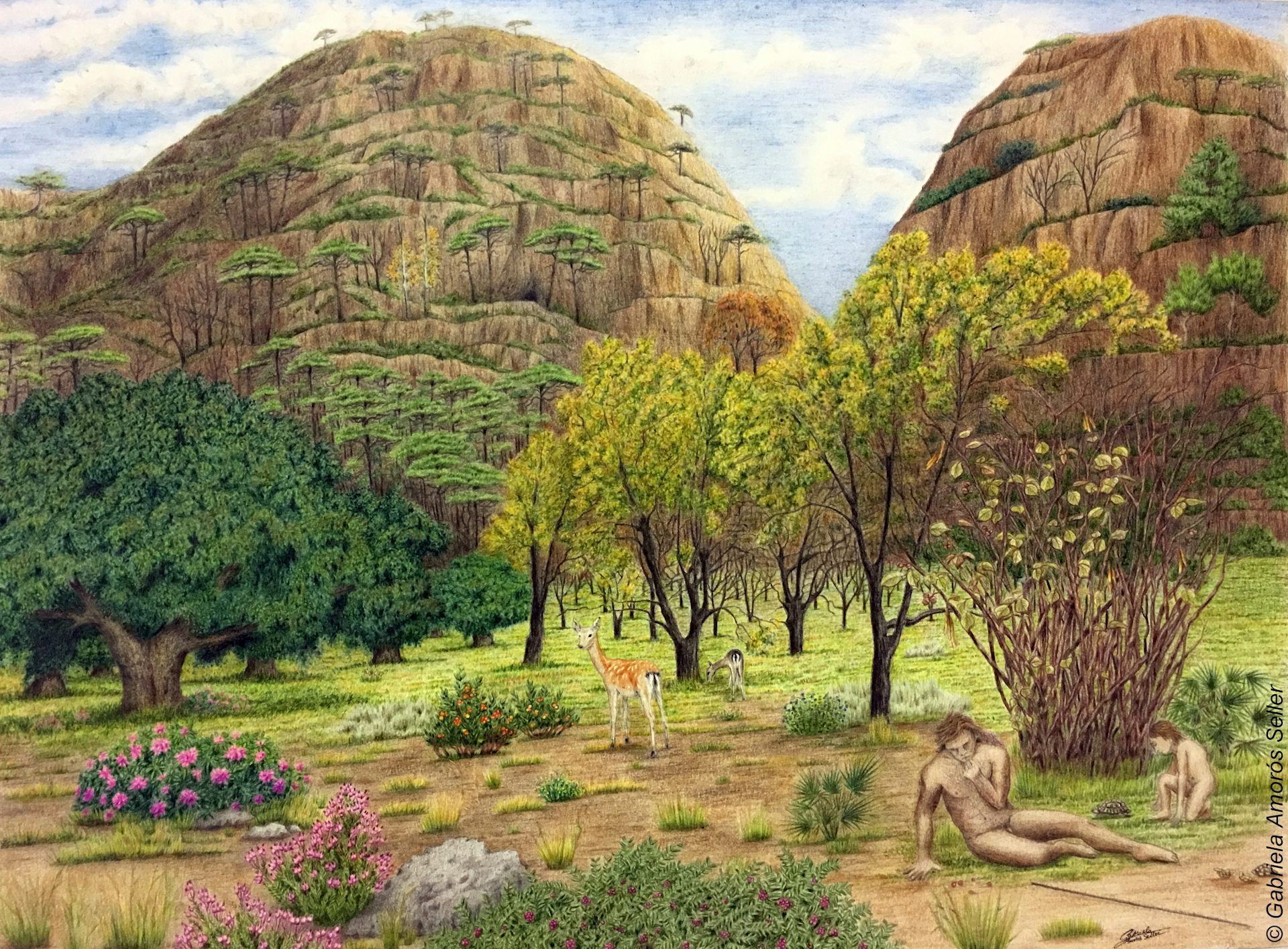 Por el gran interés paleobotánico que mostraron los hallazgos en esta cueva, decidimos hacer una reconstrucción de paisaje con una selección de las plantas que formaron parte de este entorno y que presentan mayor valor en la definición del ecosistema del momento. La palinología, o análisis del polen fósil encontrado y estudiado por el grupo ECCE HOMO de la Universidad de Murcia, nos ha proporcionado información de las plantas que crecían allí, un gran número de especies vegetales, muchas de ellas con frutos comestibles. Hasta donde sabemos, no existe un registro similar de paisaje forestal que se haya descrito en un contexto glacial. Al menos, no con tanta densidad y diversidad de plantas leñosas.