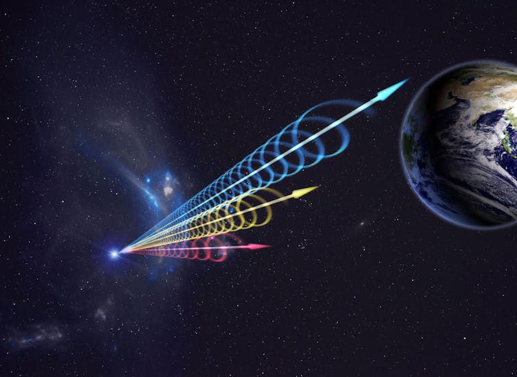 El cambio de color de los destellos se debe al material galáctico en forma de gas ionizado que se encuentra entre estas estrellas y nosotros, el cual actúa como un prisma que dispersa las ondas de radio. Gracias a la dispersión podemos determinar la cantidad de material en la trayectoria de cada pulso hacia la Tierra. Por esta razón, los púlsares son realmente útiles para estudiar la estructura y composición de la Vía Láctea.