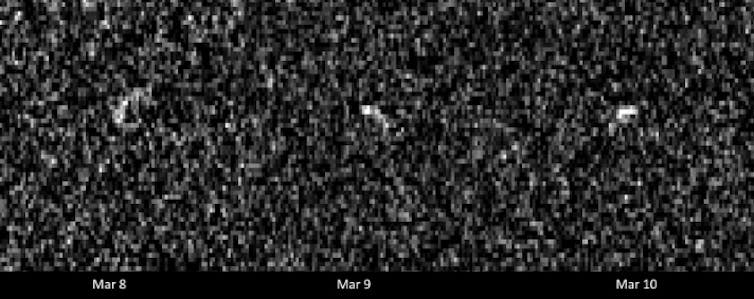 Las imágenes del asteroide Apophis obtenidas hasta la fecha son, como esta secuencia de 2021, meros ecos recibidos por las antenas de radio de Goldstone de la Red del Espacio Profundo en California y de Green Bank en Virginia. El asteroide estaba a 17 millones de km de distancia. NASA/JPL-Caltech y NSF/AUI/GBO