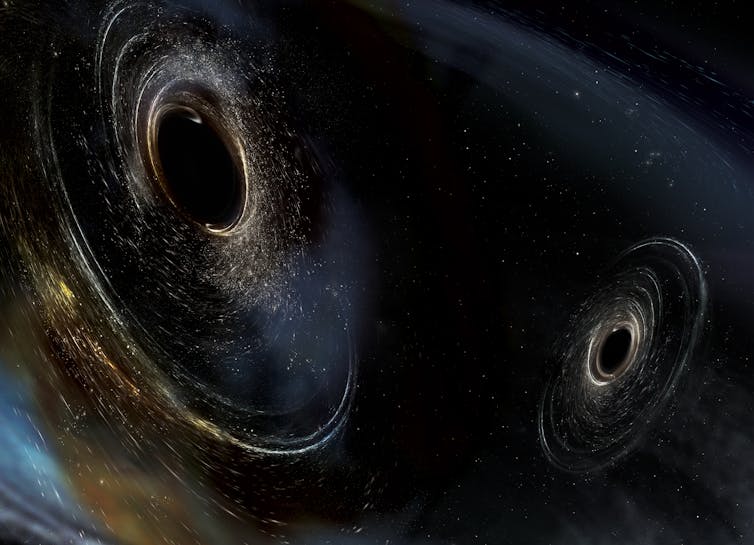 Por lo tanto, tenemos que mirar más allá de la Tierra para identificar las fuentes adecuadas. Y aquí es donde entran los agujeros negros binarios, con sus grandes masas y velocidades orbitales cercanas a la luz.