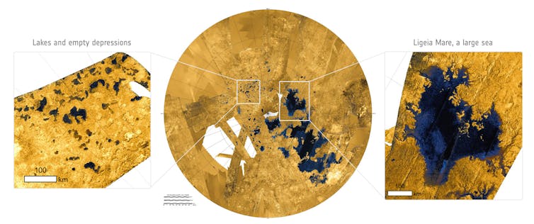 La sonda Huygens (ESA) descendió sobre el lecho seco de un río o lago en el que las imágenes de las rocas se asemejaban a cantos rodados, o sea, hubo un fluido corriendo por allí que las erosionó y dicho fluido ya no estaba. Por lo tanto, hay fenómenos meteorológicos que dependen de las estaciones y permiten la formación y desaparición de lagos (de entre 10 y 100 000 km²), principalmente en los polos.