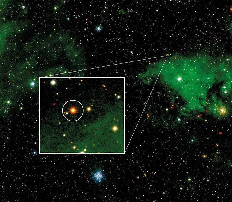 Esas regiones están llenas de nubes de gas y polvo a partir de las cuales se forman las nuevas estrellas, pero que también ocultan las estrellas que se encuentran tras ellas. Las nubes de polvo entre J20395358+40222505 y nosotros reducen su luz unas 10 000 veces, y la transforman en un punto irrelevante en las imágenes de los telescopios.