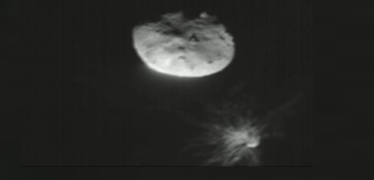 DART alcanzó Dimorphos a una velocidad de 6,14 km/s. Cuando golpeamos un asteroide a hipervelocidad, una parte de la colisión se transmite de manera elástica pero, como se excava un cráter, se crea un impulso adicional causado por la emisión de materiales en dirección opuesta al proyectil. Esa componente de “retroceso” participa en el impulso suministrado al asteroide y contribuye muy eficientemente a desviarlo de su trayectoria. De hecho, los materiales expulsados tras el impacto crearon múltiples filamentos de partículas que pudieron seguirse con telescopios desde tierra e, incluso, desde el espacio.