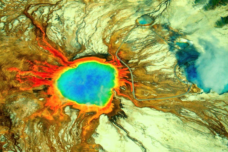 Para atestiguar este ambiente primigenio de elevadas temperaturas y ausencia de oxígeno y primeros mares prebióticos no hay más que visitar el famoso Grand Prismatic Spring de Yellowstone, el mayor lago de aguas termales de Estados Unidos y el tercero más grande del mundo. En él, la gama espectacular de colores vivos, que van del verde al rojo, es el resultado del crecimiento de bacterias pigmentadas en sus aguas ricas en minerales.