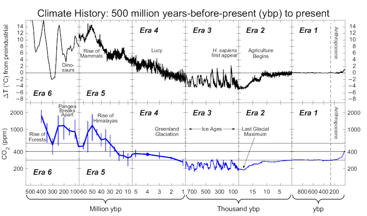 Los registros a largo plazo que suponen los testigos de hielo, los anillos de los árboles y los corales muestran que cuando los niveles de dióxido de carbono han sido altos, también lo han sido las temperaturas.