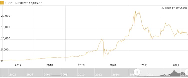 El precio del rodio se ha multiplicado más del 3 000% en este lustro. Si a inicios del año 2017 el kilogramo de rodio se cotizaba a 21 500 euros –entonces el oro le superaba con un precio de 36 000 euros–, se alcanzó un récord histórico de 822 000 euros en abril de 2021. Los estudios más recientes prevén que esta escalada de precios continúe en un futuro próximo debido al aumento de la demanda de este metal para nuevas aplicaciones tecnológicas, principalmente relacionadas con la búsqueda de soluciones sostenibles.