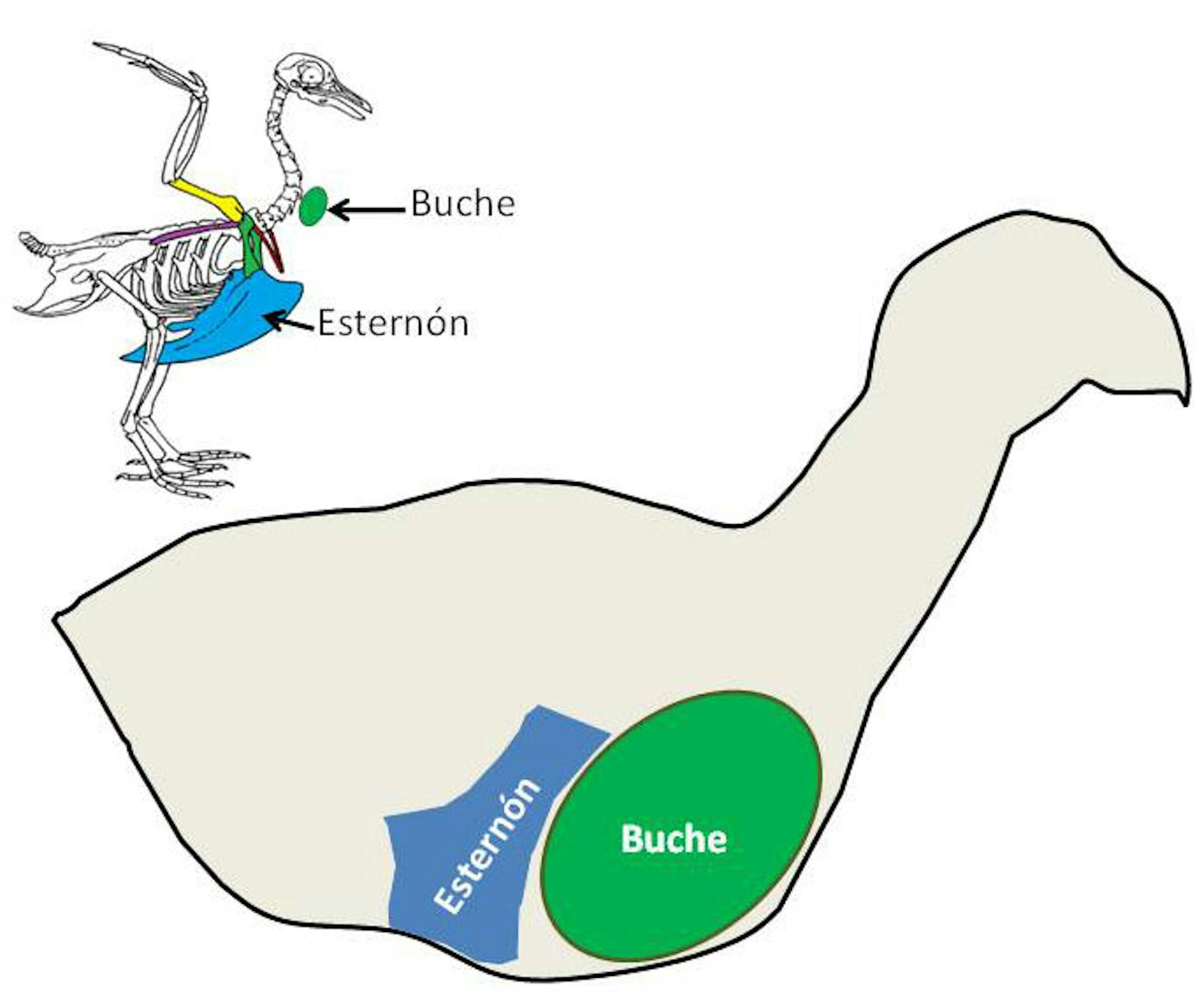 El buche del hoatzin ocupa un gran volumen de su cavidad torácica. Esta hipertrofia se hace a costa del gran esternón característico de las aves. El suyo es pequeño, con una quilla muy reducida, y está fusionado a otros huesos de la cintura pectoral. La quilla esternal es esencial para la inserción de los músculos pectorales que accionan las alas, permitiendo que un ave pueda volar.