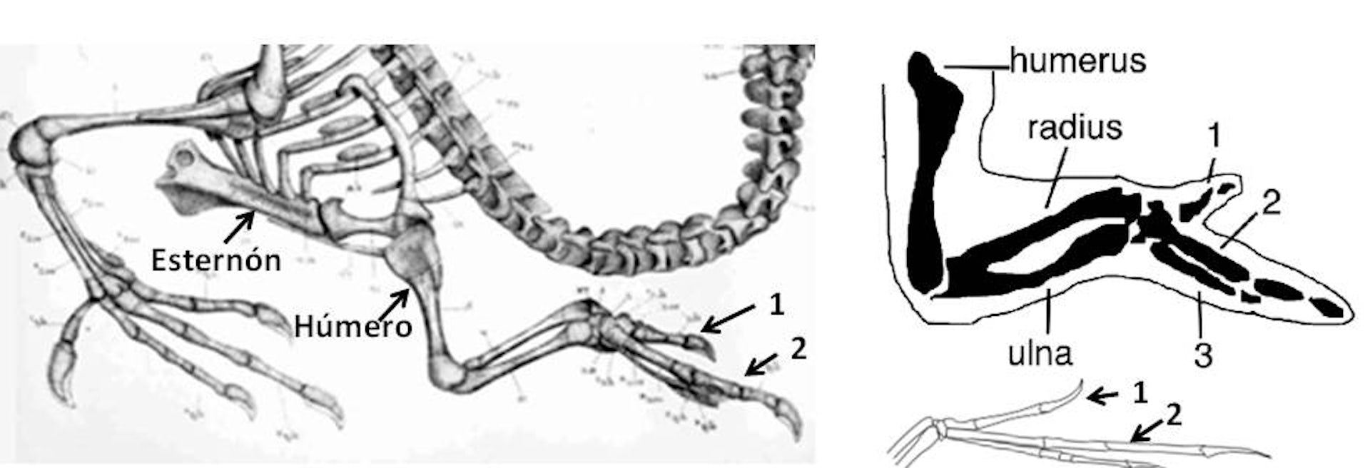 Los nidos del hoatzin se localizan sobre el agua por una importante razón. Si los pollos se ven amenazados, saltan del nido al agua, nadan con gran habilidad y vuelven a trepar a los árboles gracias a las garras que tienen en las alas. En las aves en general estas garras se perdieron en el curso de la evolución, pero los pollos del hoatzin las mantienen en el extremo de dos dedos bien desarrollados. Este patrón de los dedos en los jóvenes hoatzines recuerda al de Archaeopteryx, un género extinto de aves primitivas, con caracteres intermedios entre los dinosaurios emplumados y las aves modernas.