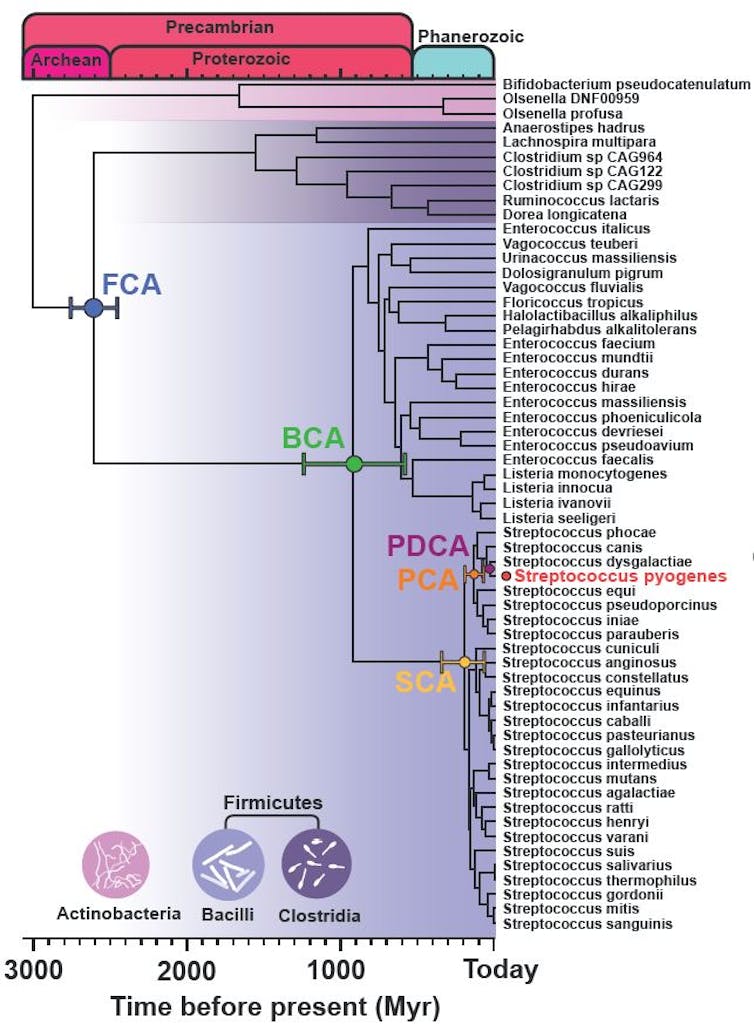 Calibrando el análisis con una línea de tiempo es posible deducir la edad en la que se sitúan los nodos de proteínas ancestrales que dieron lugar a diferentes grupos de proteínas Cas9 actuales.