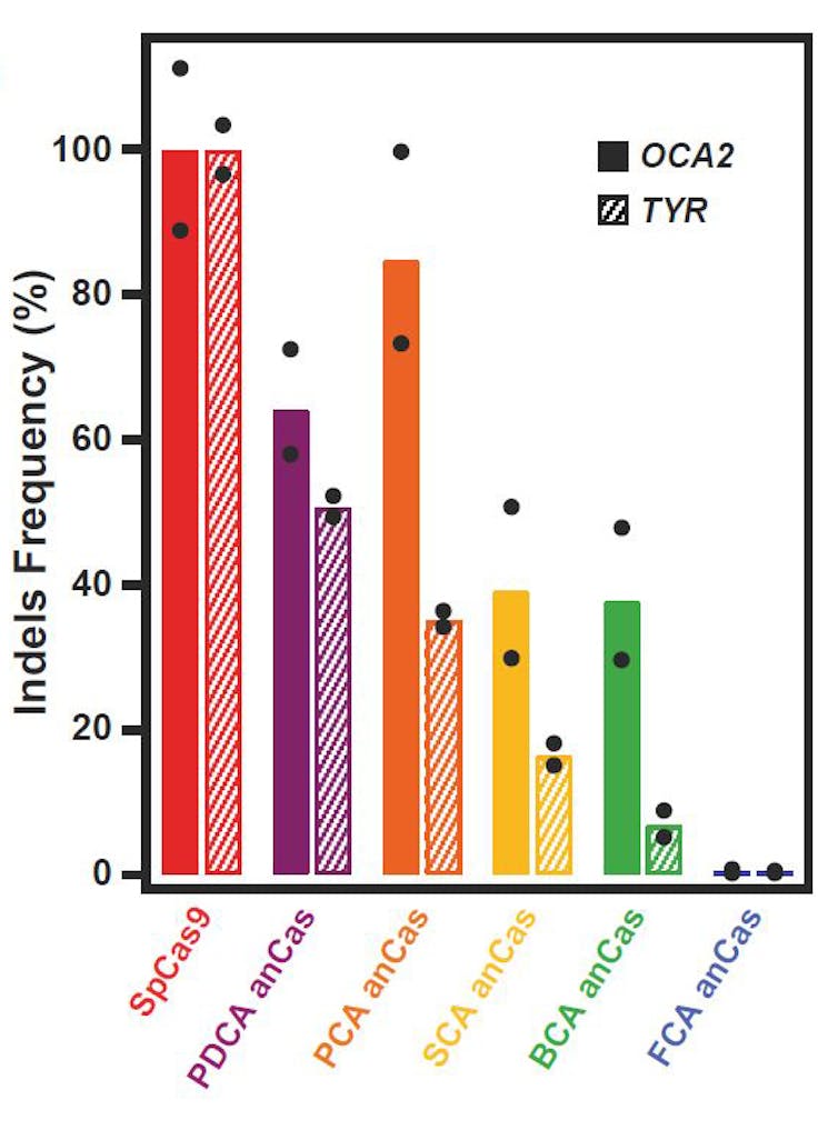 El resultado no pudo ser más sorprendente. Las cuatro Cas ancestrales datadas entre 37 y 1 000 millones de años atrás, las denominadas PDCA, PCA, SCA y BCA, funcionaban relativamente bien en células humanas. Todas ellas promovían la edición de los dos genes seleccionados, con eficiencias de edición genética (medidas como porcentaje de secuencias de estos dos genes con inserciones o deleciones, INDELs) que oscilaban entre un 5% y más del 80%.