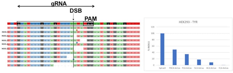 Más sorprendente todavía: la cicatriz que dejan estas nucleasas Cas ancestrales es muy similar a la que deja la SpCas9 de referencia. En el gráfico anterior puede verse que los nueve alelos más frecuentes encontrados tras transfectar las células humanas HEL293T, bien con la SpCas9 o con PDCA, PCA, SCA y BCA, son comparables, lo que sugiere que su modo de acción (de corte de doble cadena), a pesar de los millones de años que sobre el papel las separan, no ha variado sustancialmente. Además, el sistema de reparación endógeno celular se encuentra con cortes de doble cadena similares que, lógicamente, también acaba reparando de forma similar, según la secuencia de ADN y su contexto.